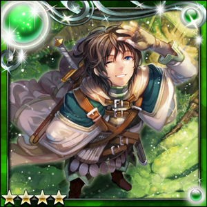 Aaron has neck short brunette hair and deep blue eyes. He wears a traditional adventurer cape and garb and uses a long sword for a weapon.