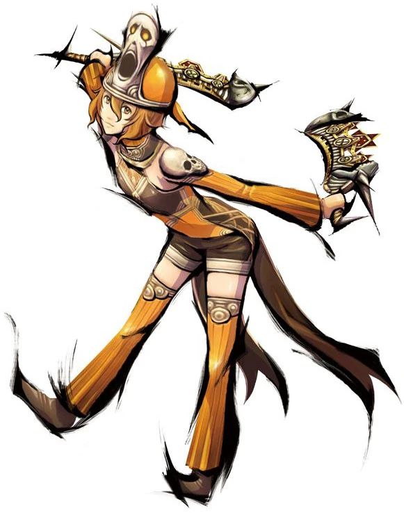 Jahad wears a predominantly orange toned outfit with skull motifs on her shoulders. She wears an orange handkerchief on her head that is pulled tight by a morbid tiara baring a screaming face.
