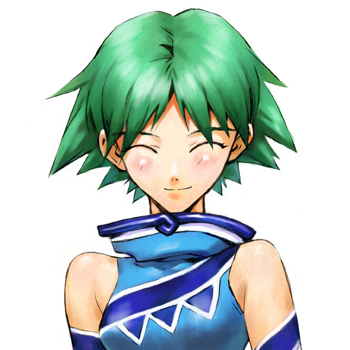 Natsume is a Twin Blade with green hair and a blue one-piece outfit. Her dress is adorned with triangular patterns; blue symbols (the same one that appear on Kite's hat) appear on her gloves and in the form of tattoos on her legs. According to the official .hack JP website, her chosen waves are Fire and Wood. She uses a character Model similar to that of A-20.