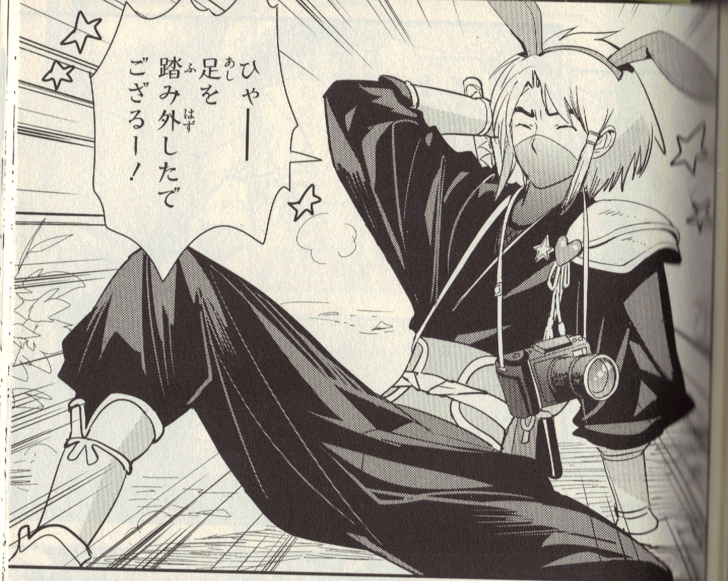 Ninjato (忍者刀) is a masked avatar dressed like a ninja. He has bunny ears, keeps a camera around his neck and wears a doll of a shrine maiden holding a weapon on his back. During the .hack//Link game he appears as a beast character.