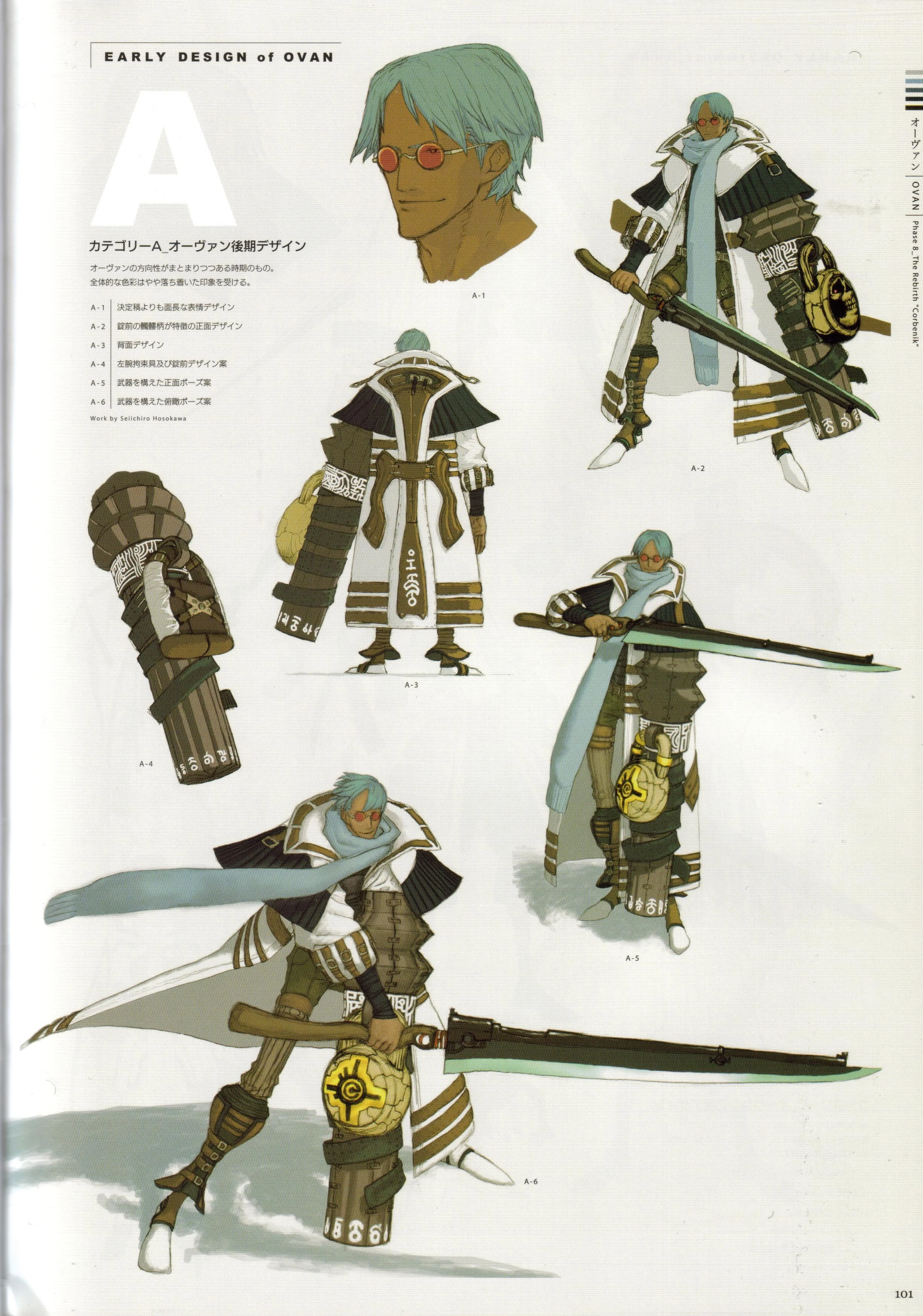 Ovan is dressed mostly in blue tones, with traces of leather scattered throughout his outfit coupled with a long, flowing blue scarf. He wears a pair of orange sunglasses and used to have his left arm encased in a huge metal cylinder equipped with a lock to hide something. His hair is short and is blue like his clothes. According to an interview, Ovan's character was designed to be the exact opposite of Haseo. Ovan is a mysterious, tanned adult, while Haseo is a pale, teenage-looking youth. Ovan's white and blue color scheme runs perfectly contrary to Haseo's black and red. The true color of his eyes are a light blue as in the game, and seen only once and for only a brief time.