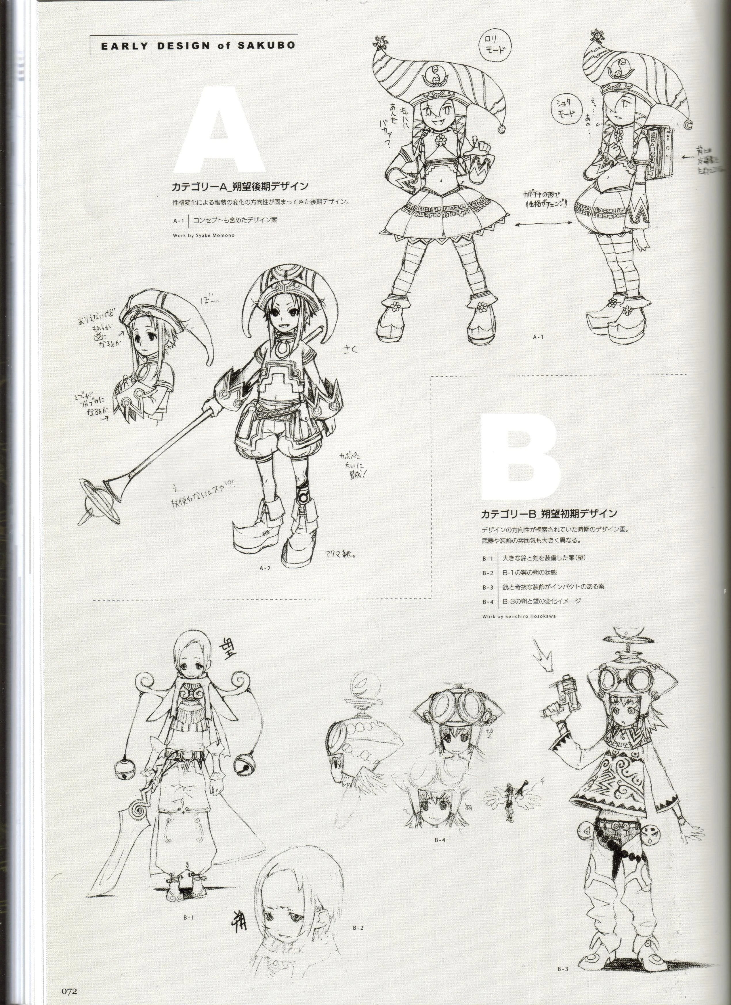 Sakubo's appearance is that of a young girl with blond hair and a harlequin outfit. She wears a large oversized jester's hat with ornaments resembling the sun and the moon hanging from it. Depending on which player is active, the hat changes slightly. When Saku is playing the sun symbol is raised up, and while Bo plays it's exactly the opposite, with the moon symbol raised. Other notable features include the fact that while Saku is playing, her hair flairs up to give a spiked look, but while Bo is playing, his hair lays flat. Also, the "skirt" that Sakubo wears changes. While Saku is active, it opens up into a skirt, while it resembles a pair of shorts as Bo. Another difference is that Saku's backpack is red while Bo's is black. When fighting she uses a large book to cast spells, as typical of her class. Sakubo's grimoire has a sun and moon motif on each side of the cover. Coincidentally, Sakubo's Lost Weapon changes in appearance depending on who uses it. When Saku uses it the cover and back are two suns, and when Bo uses it they're two moons.