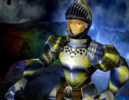 Sieg's appearance is that of a European knight, similar to that of his idol Balmung. A powerful Blademaster, he wears a full suit of plate armor, the visor raised on his helmet to reveal his handsome face and curly blonde hair. Wave symbols cover the majority of his armor.