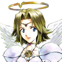 Terajima Ryoko has a character design that resembles an angel. Similar to Subaru's design other than the color scheme, hair style, and diadem instead of a wave mark on her forehead. She has golden brown hair with a halo and a shiny white dress. Her angelic wings gives her the ability to hover above the ground slightly, as shown when commanding her to heal the party.