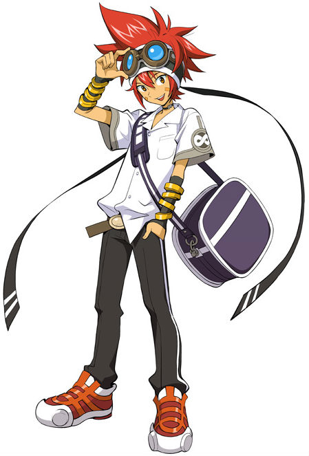 Tokio first appears identical to his offline apperance from the moment he entered The World R:X. His most distinguishing features are his goggles, messenger bag, yellow tape on both cheeks, and a pair of long black-and-yellow wristbands. In contrast to the light armor Tokio imagined himself wearing he has the same black pants and white shirt with two symbols for infinity on the sleeve that he wears to school. Tokio wields a double edge sword in his right hand and a twin sword mimicking Kite's amateur blades in his left hand.